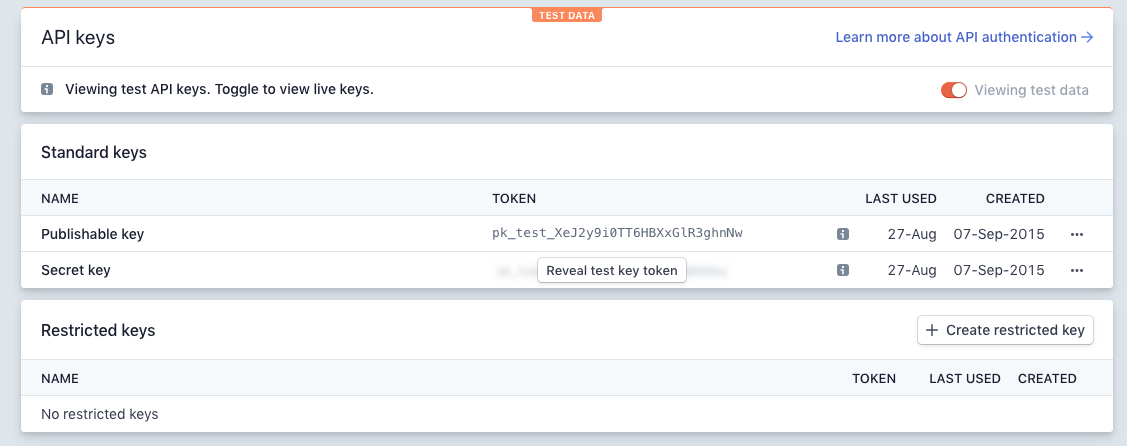 If you toggled “Viewing testing data“, Stripe will show the test keys, otherwise, the live keys will be shown, for production you will need the “Live Secret Key” and “Live Publishable Key“